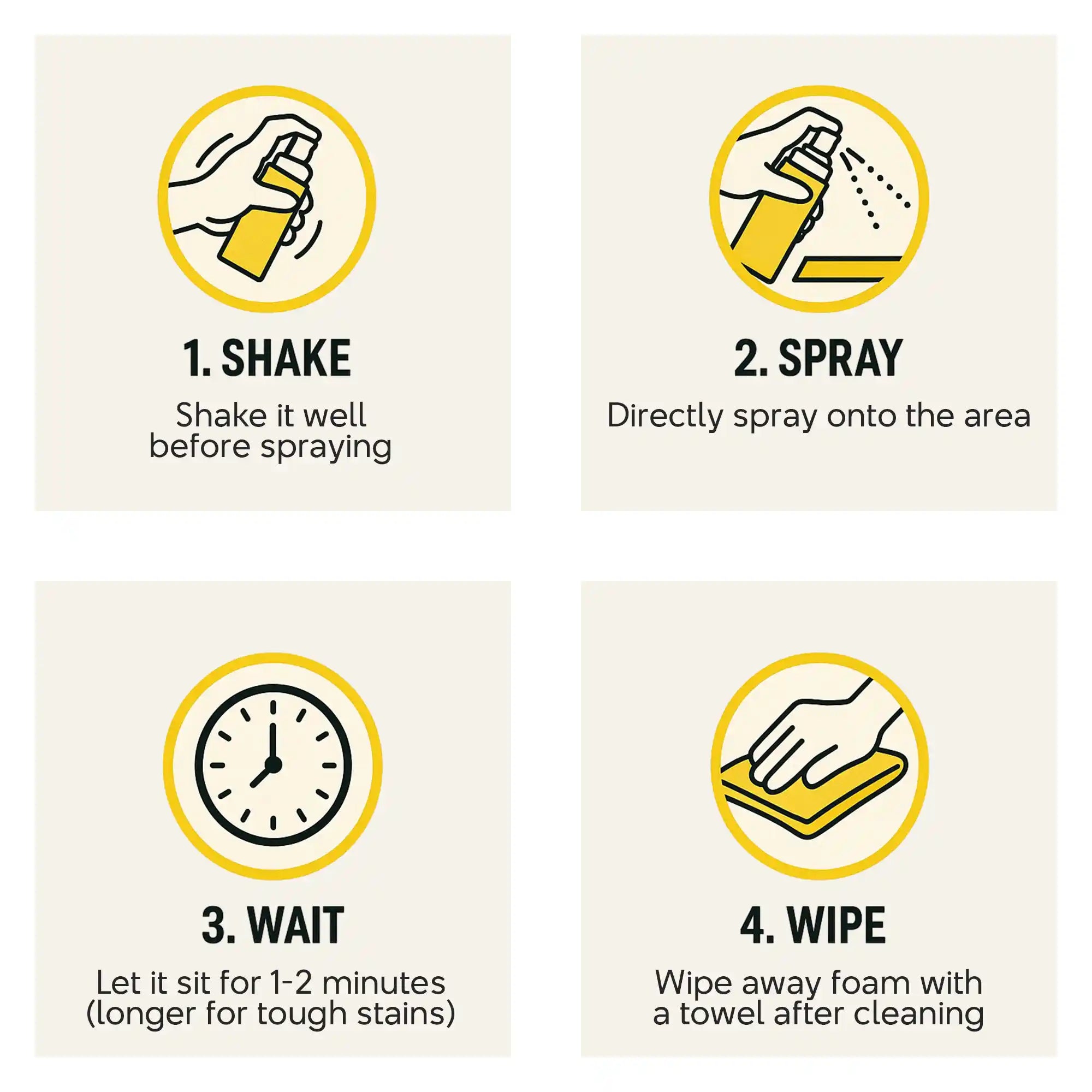 Simply spray the foam onto the surface, let it sit for a few seconds, then wipe clean with a cloth or sponge.