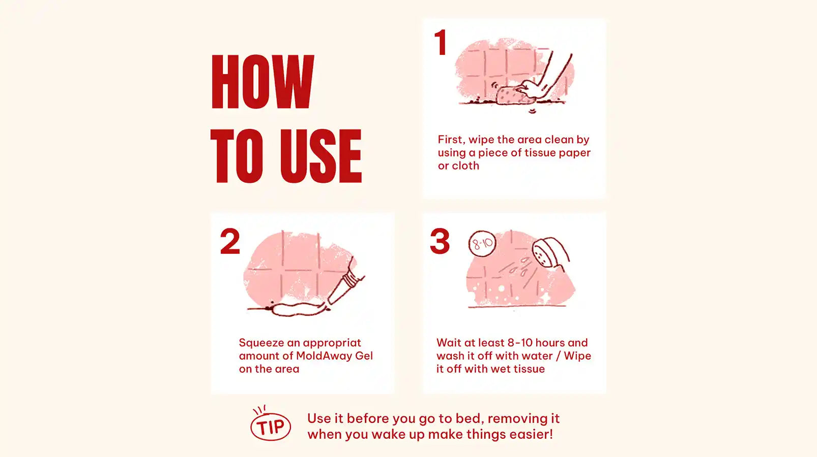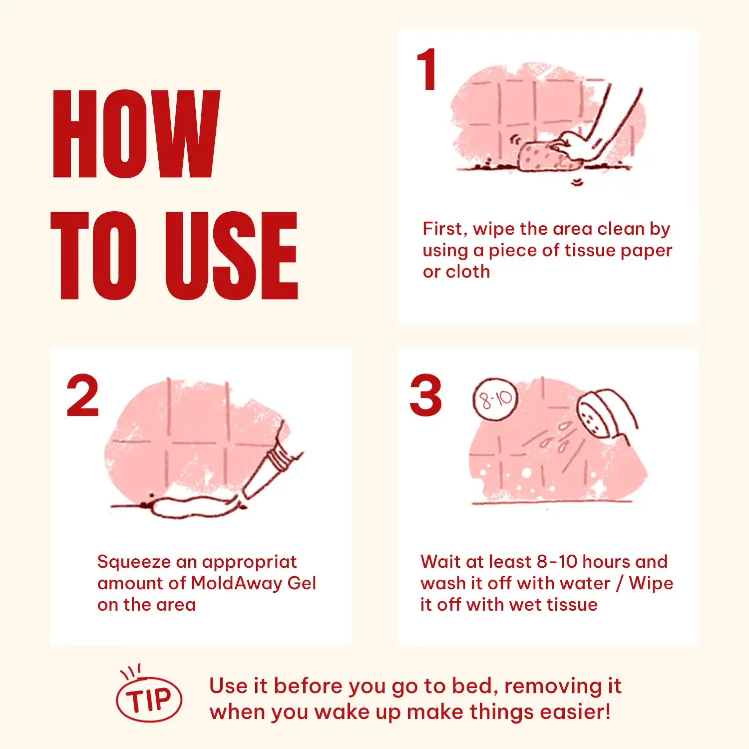 - Apply the gel directly to the moldy area. Let it sit for 5-8 hours, then wipe or rinse off with a cloth or water. Use the included scraper for stubborn spots.